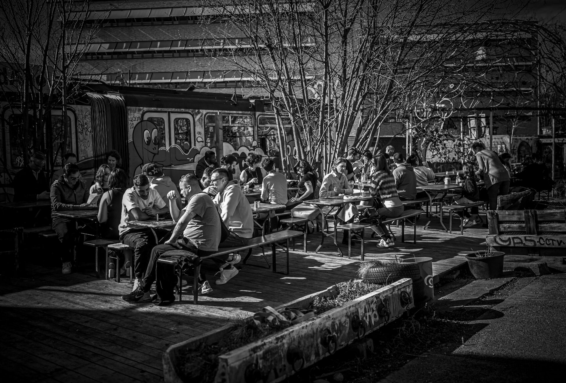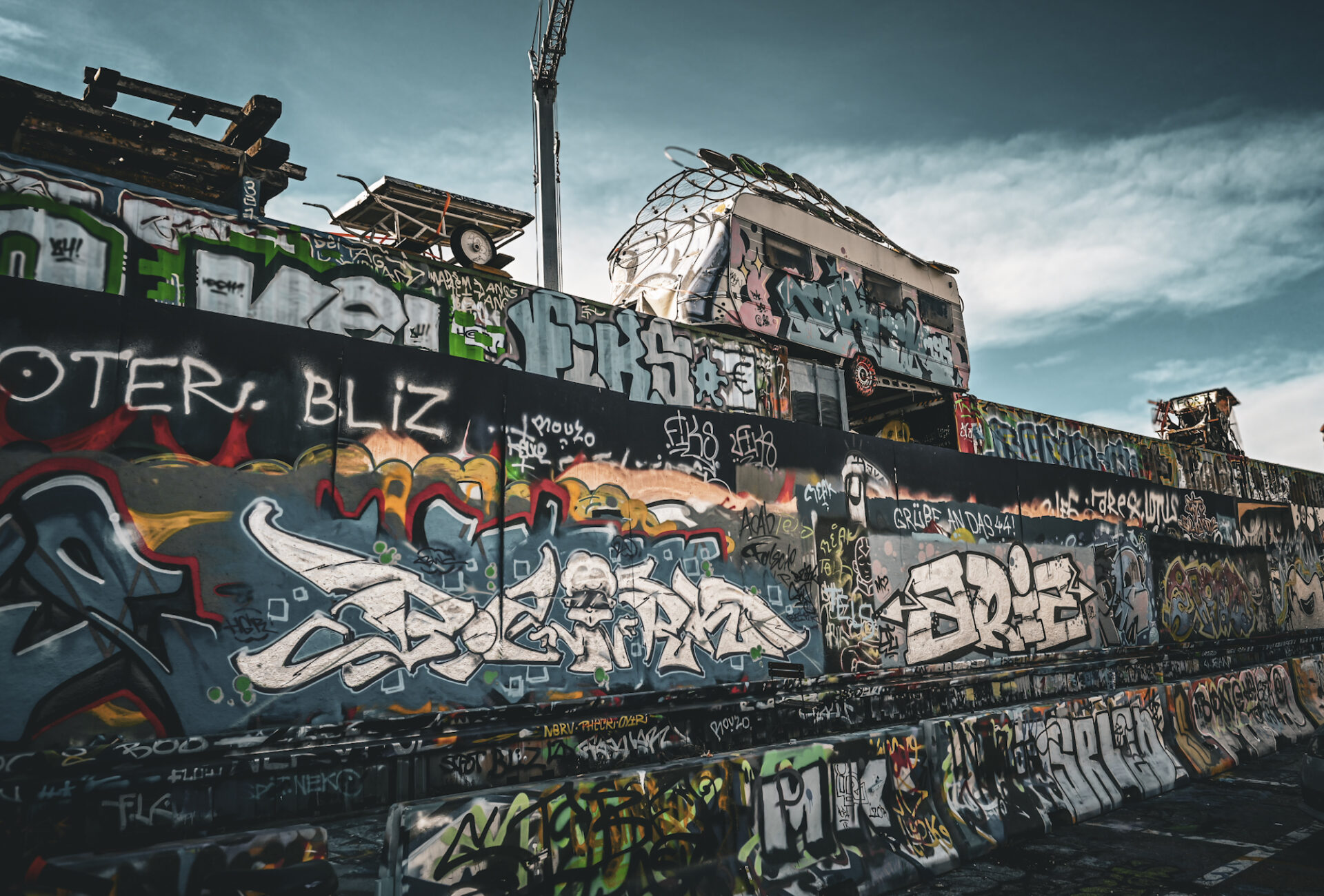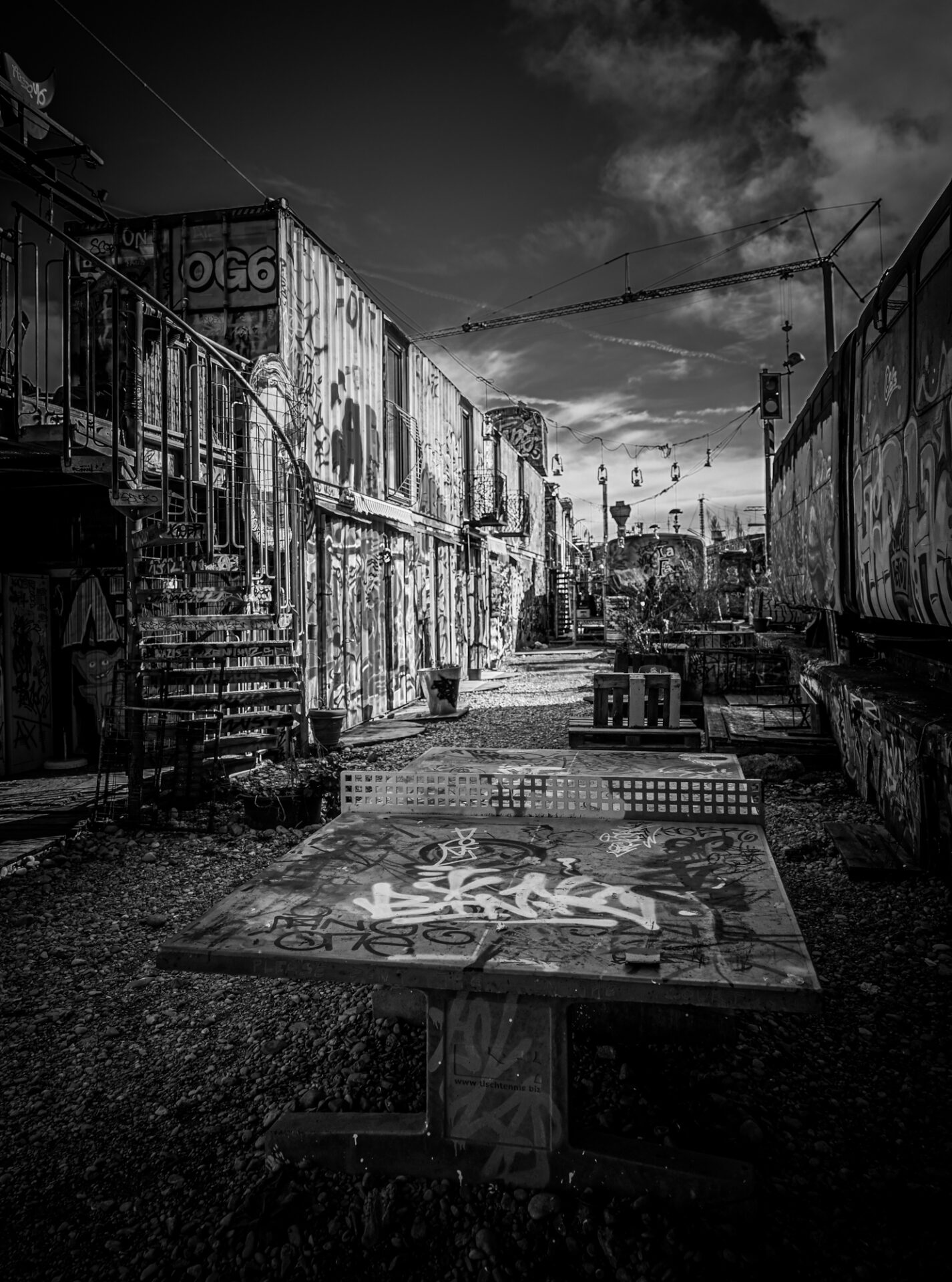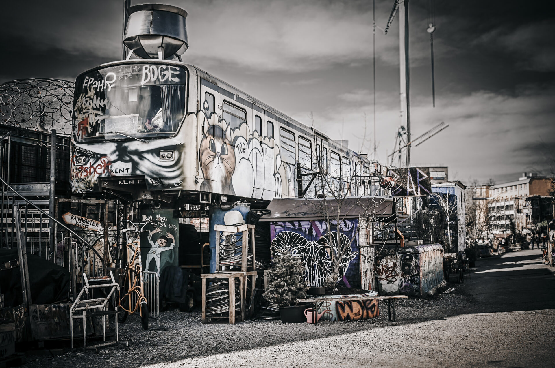 The distinctive architecture of the Schlachthofviertel, characterized by historic buildings and warehouses, lends it a unique charm. Here, one can find the Bahnwärter Thiel, a lively meeting point that combines art and culture and makes it accessible to everyone. An intriguing ensemble of Munich tram and subway cars, artistically painted shipping containers, and a crane with floating gondolas and sturdy carriages forms a unique backdrop for encounters and diverse events.